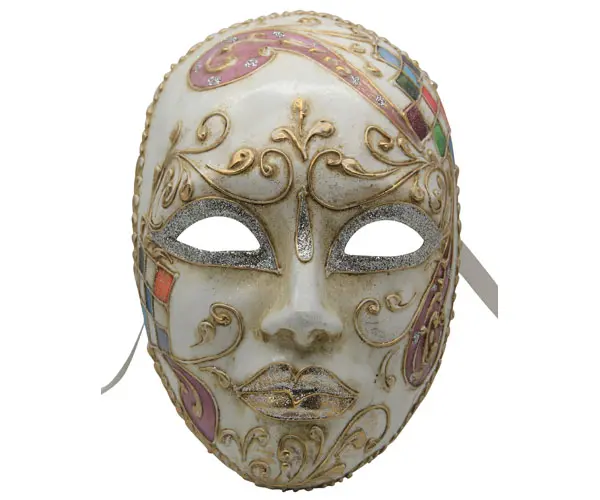 This handmade in Europe authentic paper Mache Venetian full face masquerade mask features a white base with gold detailing all over the mask. It also features silver lips and silver glitter eye lining with multi-coloured swirl designs over the forehead and one cheek. It comes complete with white ribbon ties.